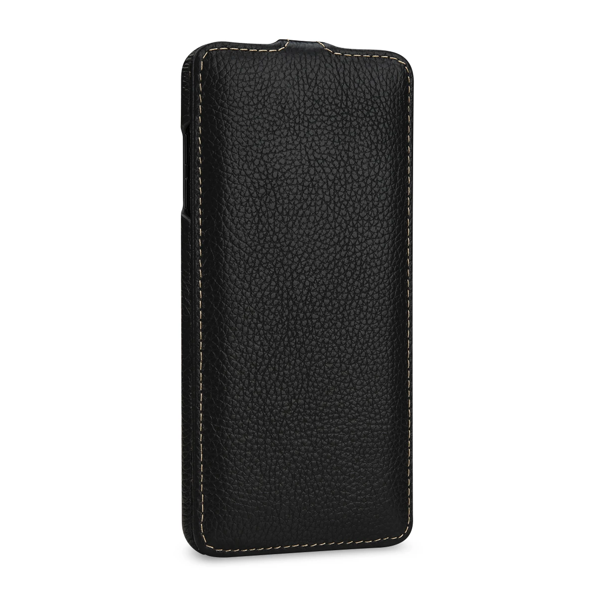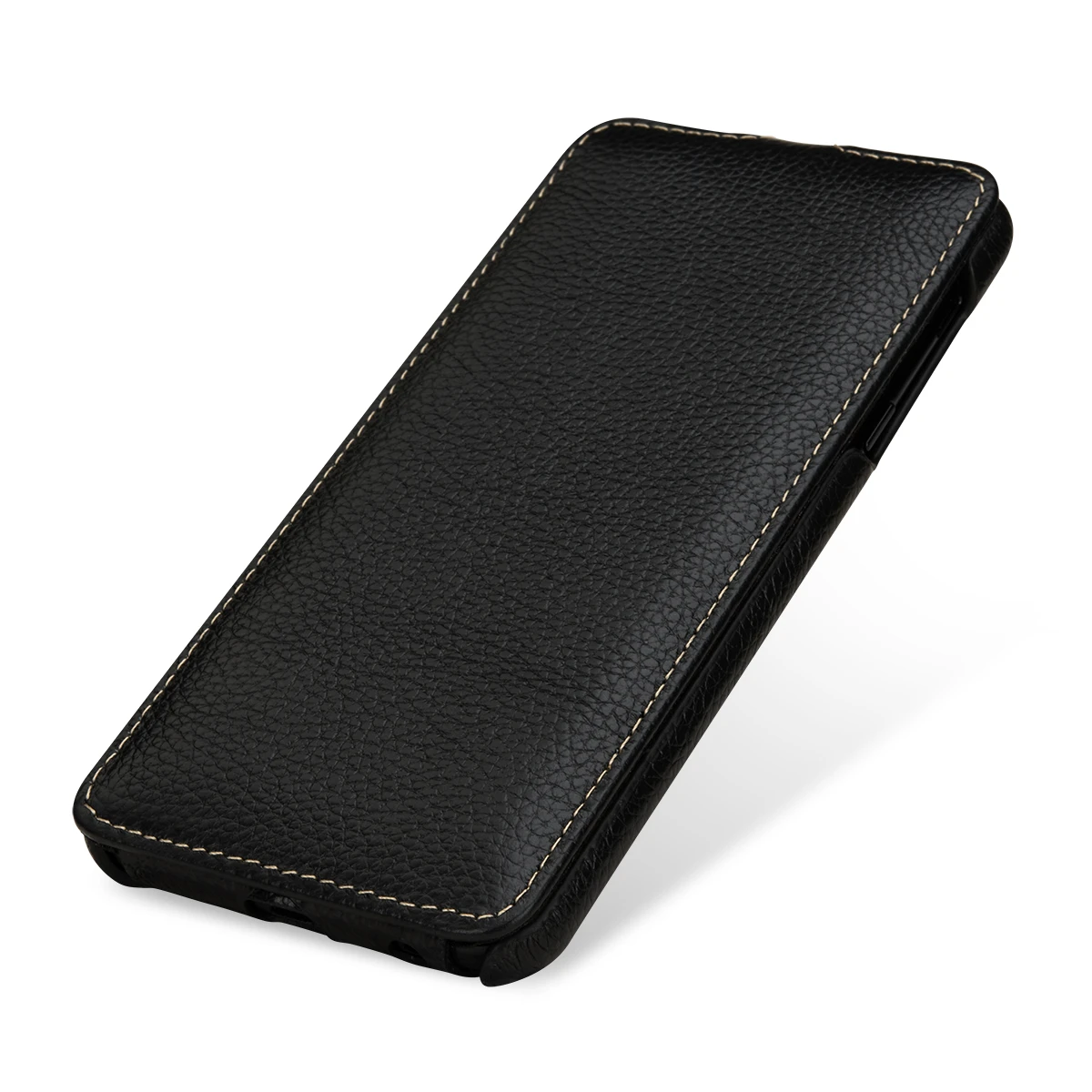 Schlankes und leichtes Lederetui mit nach unten umklappbarem Deckel